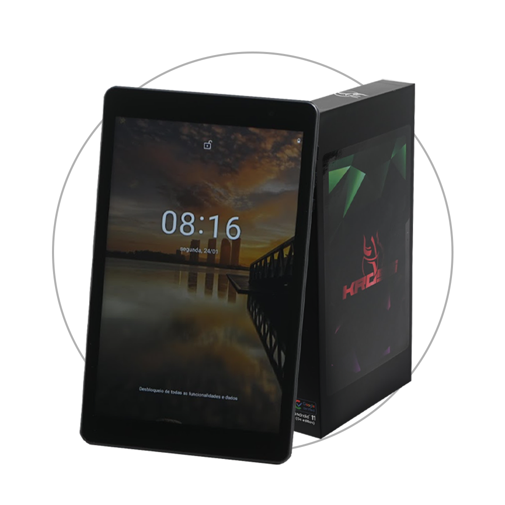 Esse é o Tablet Kross Aric, com tela de 8 polegadas, processador quad-core A133, com 2GB de memória RAM e 32GB de Armazenamento para guardar os seus dados, possui um design simples e robusto para o uso diário, com uma câmera frontal de 2MP e traseira de 5MP para fotos em vídeos direto em seu tablet